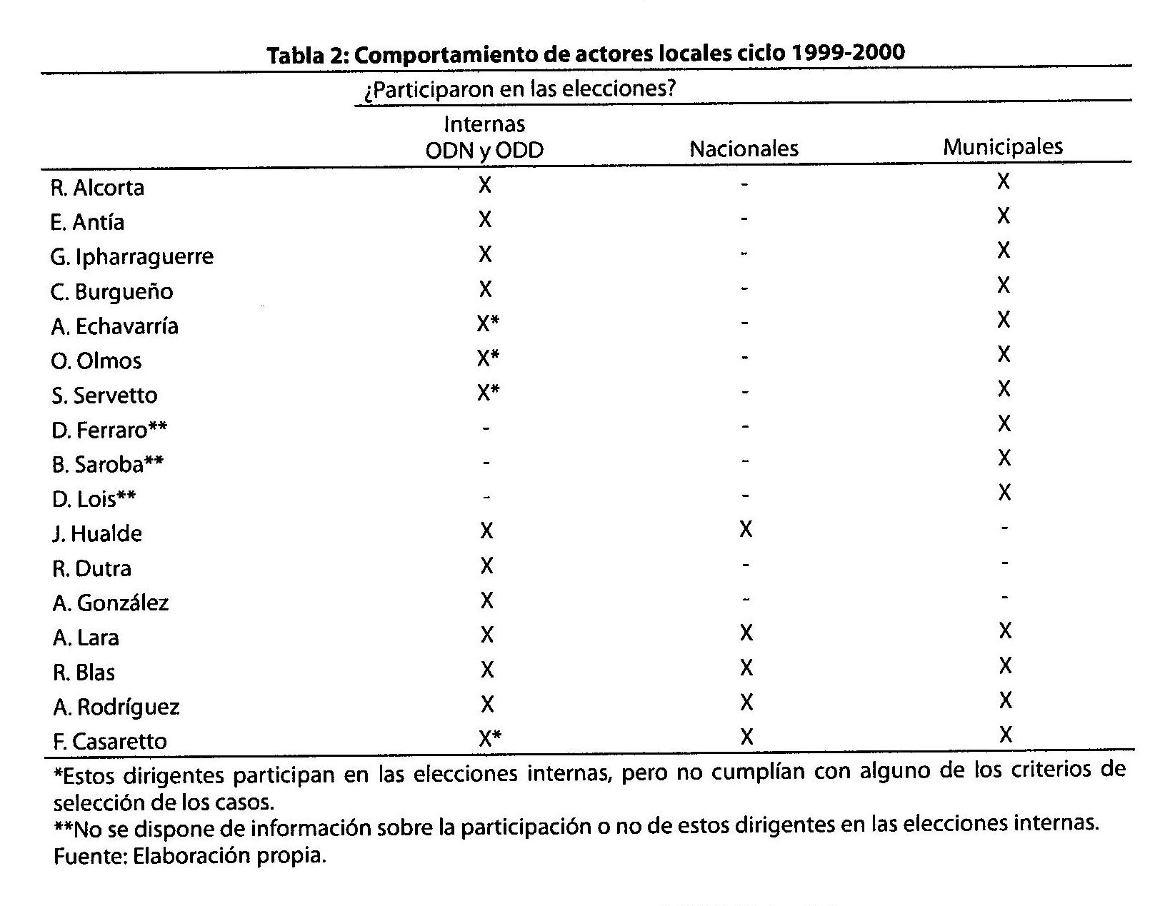 Análisis del comportamiento de los actores. Para concluir con el análisis del ciclo electoral 1999-2000 y con la finalidad de esquematizar el comportamiento de los actores en las tres instancias, se presenta la siguiente tabla. Los dirigentes escogidos fueron aquellos que encabezaron listas a ODD, ODN, Cámara de Representantes, Junta Departamental y/o fueron candidatos a intendente, y que además sus hojas de votación obtuvieron más del 5% de los votos del partido en alguno de los comicios del ciclo electoral. En las hojas que obtuvieron más del 10% en las elecciones municipales se toma en cuenta también al segundo en la lista, ya que suelen ser actores de relevancia. A partir de estos criterios de selección surgen 17 dirigentes, los cuales pueden aparecer en una, en varias o en todas las elecciones realizadas en este ciclo.
