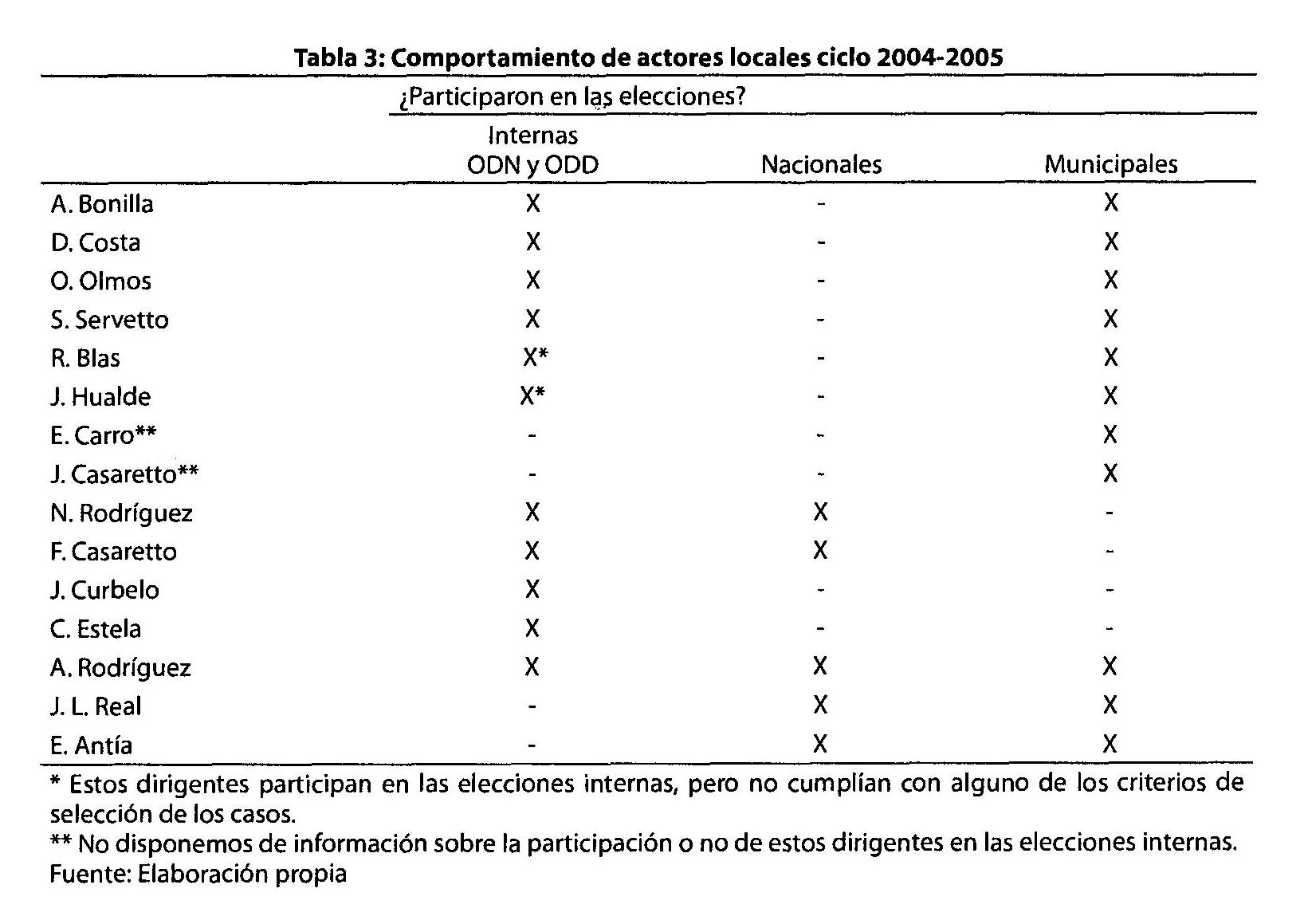 Análisis del comportamiento de los actores. En último lugar, y al igual que se realizó con el ciclo 1999-2000, se presenta un cuadro comparativo del comportamiento de los principales actores políticos departamentales nacionalistas. Los criterios de selección fueron los mismos que para el ciclo anterior, surgiendo en este caso 15 dirigentes a analizar.