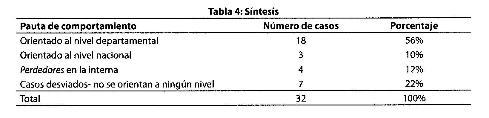 Observando el comportamiento particular de los actores seleccionados para el análisis se pueden reconocer cuatro pautas de comportamiento básico. En primer lugar, se encuentran los actores orientados al nivel departamental, los cuales participan en las elecciones internas y en las municipales, y no en las nacionales. Asimismo, también pueden ser considerados en esta categoría aquellos que aún no jugando un rol importante en las internas, sí participan en ellas, luego no lo hacen en los comicios nacionales, "reapareciendo" en las municipales. Dentro de esta primera pauta de comportamiento se ubican 18 de los 32 casos analizados (56% del total).