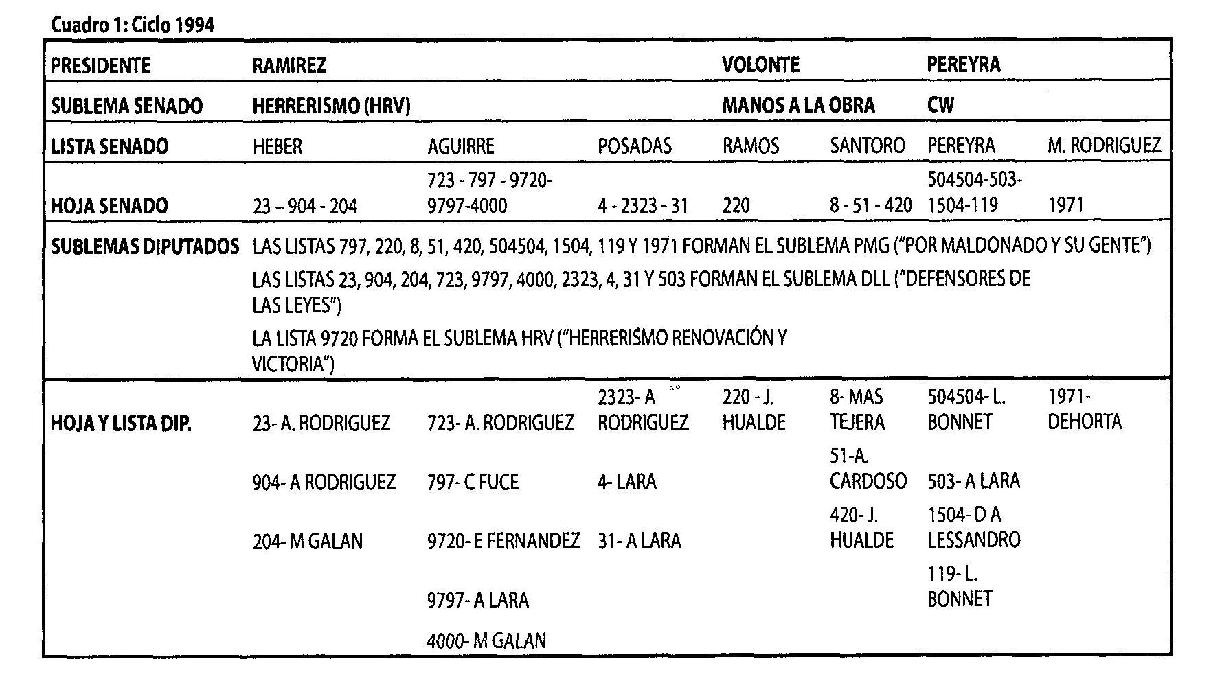 Al observar el "mapa"[5] de sublemas y listas que se presentan para la elección de diputados, y su articulación con los sublemas, listas al Senado y candidatos a presidente, notamos que hay actores locales que apoyan a más de un candidato a presidencial. Por ejemplo, Alfredo Lara encabeza tres listas a diputados: dos de ellas apoyan al candidato presidencial herrerista, Juan Andrés Ramírez: una de ellas encabezada por Gonzalo Aguirre (hoja 9797), y la otra por Ignacio de Posadas (hojas 4 y 31) como candidatos a senador. La tercera lista apoya al candidato presidencial del Movimiento Nacional de Rocha, Carlos Julio Pereyra (hoja 503). Un caso similar es el del sublema a diputados "Por Maldonado y su gente", el cual reúne sectores que apoyan a los tres candidatos a presidente. Esto es posible gracias al sistema electoral imperante hasta el año 1996 en nuestro país, particularmente al múltiple voto simultáneo.