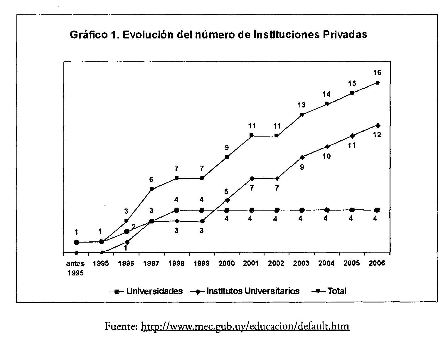 Cuatro universidades y a doce institutos universitarios fueron creados entre 1995 y 2006 como indica el gráfico 1.