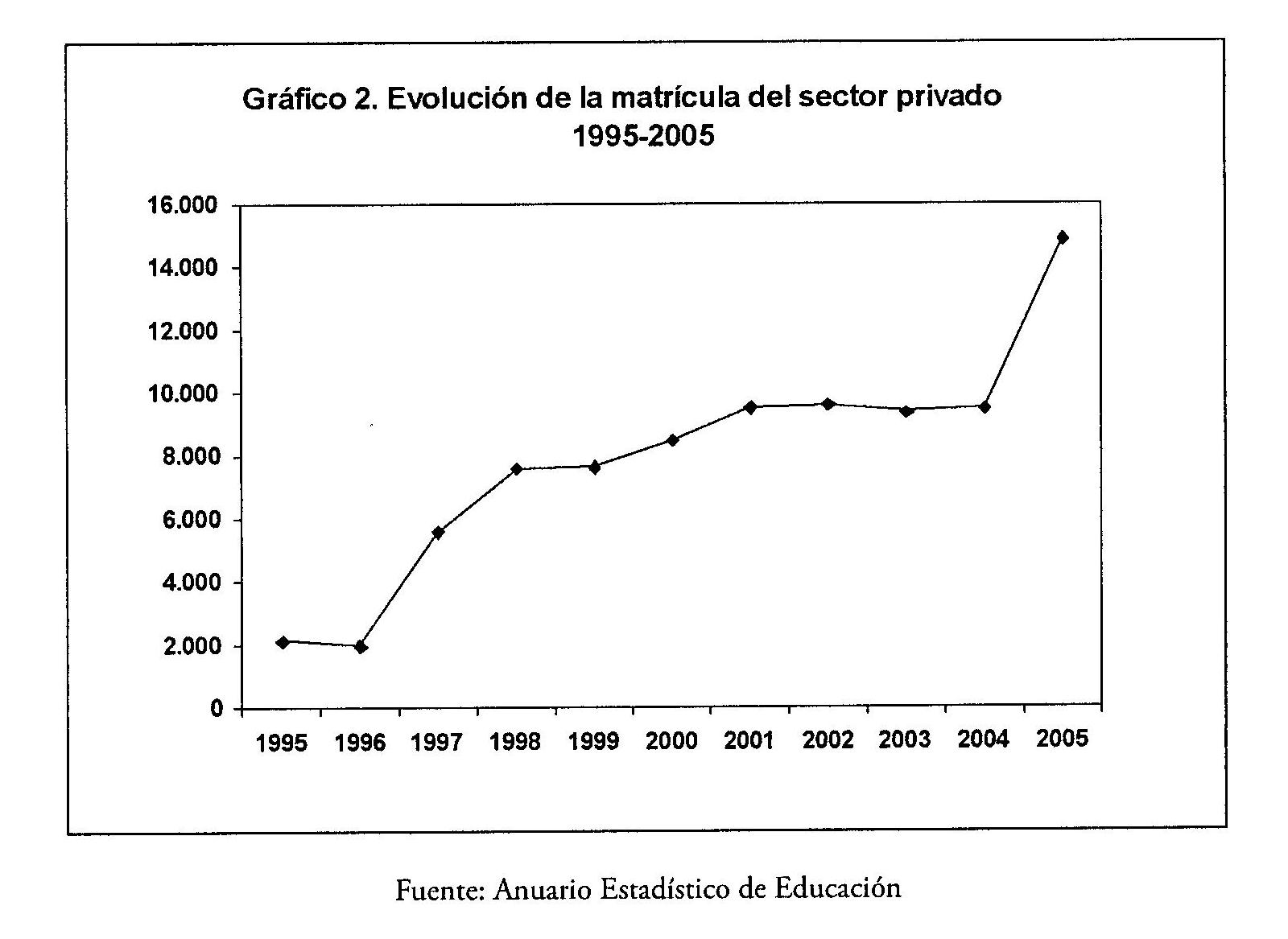 Por su parte, el sector privado también aumentó significativamente su matrícula, creciendo de 2.147 estudiantes en 1995 a 14.863 en el 2005.