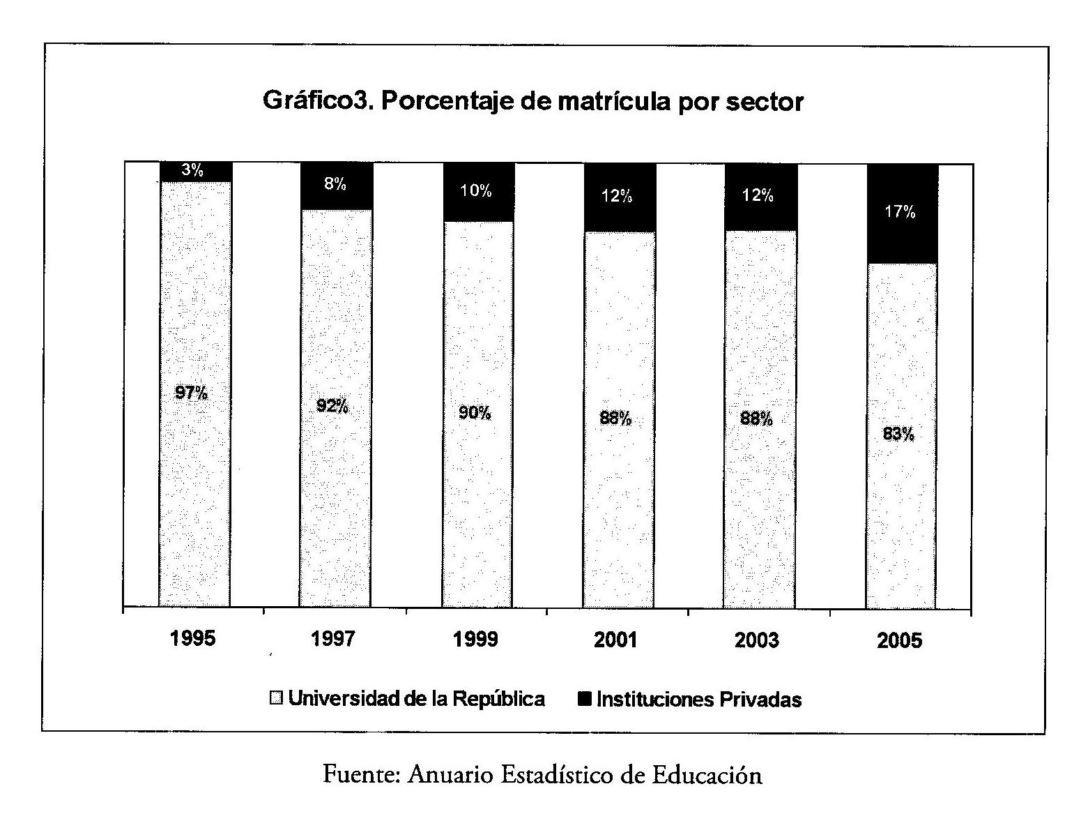 Las instituciones privadas están recibiendo una parte creciente de la matrícula universitaria, pasando de 3% en el año 1995 a 17,5% un década más tarde. Uruguay está lejos de Chile, Colombia y Brasil que superan el 50% del total de estudiantes en el sector privado, y se encuentra más cerca de Argentina con el 14% (Brunner, 2005).