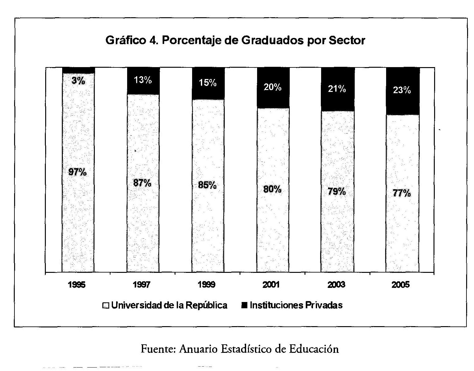 Por el contrario, las instituciones privadas tienen mejores tasas de graduación. La proporción de graduaciones del sector privado sobre las totales aumentó de 3% en 1995 a el 23% de 2005. El gráfico 4 retrata la parte cada vez mayor de graduados del sector privado que ingresan al mercado laboral.