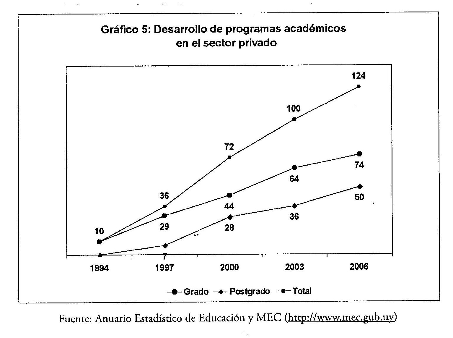 En el caso uruguayo, el desarrollo de nuevos programas académicos ha impulsado la diferenciación. Las instituciones privadas han sido muy activas en la creación de programas nuevos para atraer a estudiantes, siendo exitosas en términos de inscripciones en el nivel de postgrado (maestrías y programas de especialización) y en algunos campos de estudio como la administración, ciencias sociales/humanidades, y el tecnológico. La estrategia de desarrollar programas no ha tenido impacto significativo en campos profesionales tradicionales como la salud (principalmente medicina) y el Derecho, donde el grueso de las inscripciones se registra en la universidad pública. Finalmente, las instituciones privadas no avanzaron en el desarrollo de programas doctorales, debido al isomorfismo coercitivo impulsado por la venerable universidad pública influyendo en la acción del Estado, como ha sido la práctica en diversos países (Levy 1999).