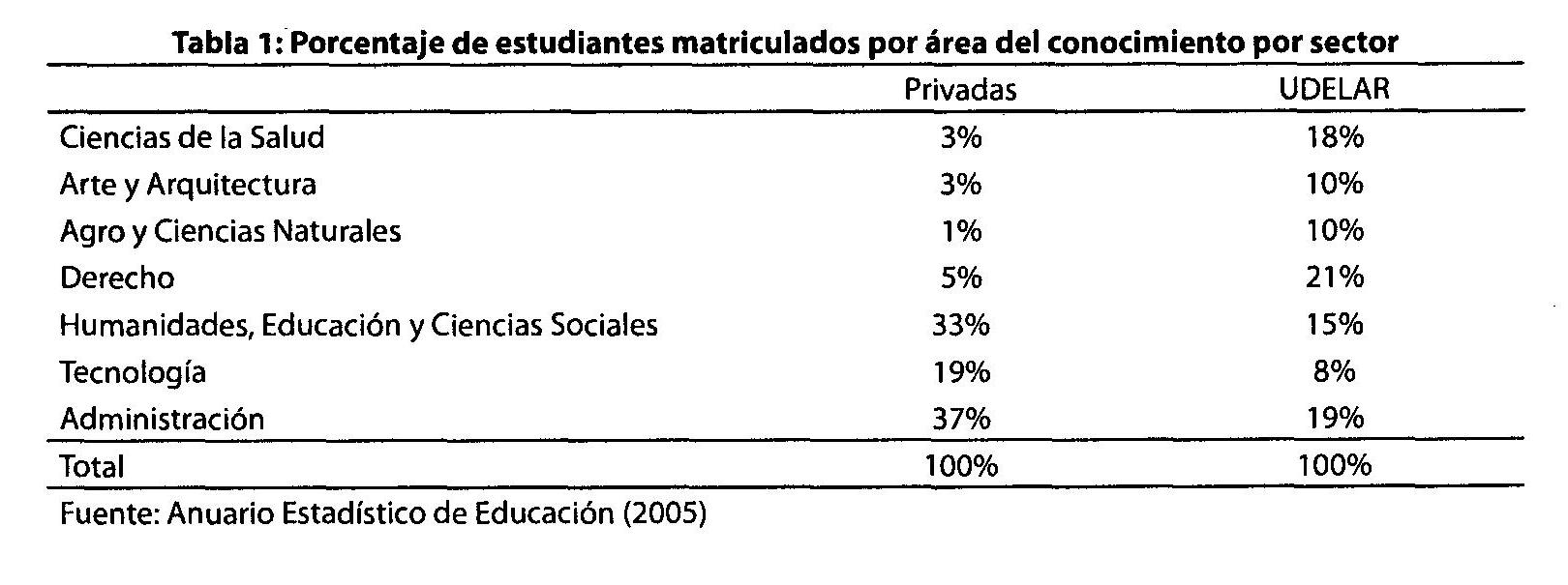 Algunas semejanzas y contrastes entre la universidad pública y las instituciones privadas se pueden identificar en términos de inscripciones por campo del estudio. La Administración es popular en ambos sectores, con el 37% de la matrícula en el sector privado y casi 20% en el lado público. Los contrastes importantes se pueden observar en los campos profesionales de Derecho y Ciencias de la Salud, donde la Universidad de la República concentra casi el 40% de su matrícula total. Las instituciones privadas se están centrando cada vez más en los campos orientados a la tecnología donde la universidad nacional alista solamente el 8% de sus estudiantes. Un dato que sorprende para el país es el campo de la agricultura y de las ciencias naturales, con solamente el 10% de las inscripciones en el sector público y el 1% en el privado, siendo el sector más importante de la economía del país.