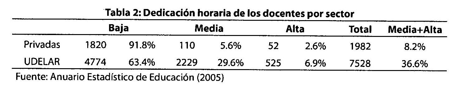 Un factor que facilita la contratación de docentes de la universidad nacional por parte de las instituciones privadas es el nivel bajo número de docentes a tiempo completo en el sector público. En la Universidad de la República, solamente un 7% gozan de un régimen de dedicación total y un 30% son part-time; el resto se contrata solamente por las horas que enseñan.