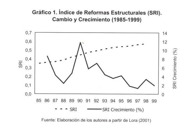 Aunque hay análisis extremadamente ricos sobre las causas y consecuencias de las reformas estructurales[3], pocas investigaciones ofrecen claros indicadores capaces de medir el progreso y magnitud de las mismas. Como argumenta Lora, "la falta de información precisa sobre la magnitud de las reformas ha sido un obstáculo para evaluar la relativa importancia de las diferentes áreas de reforma, y distinguir entre los efectos de las reformas estructurales per se y aquellos resultados de la estabilización macroeconómica" (Lora, 2001: 19; traducción de los autores). Como resultado, para capturar la magnitud de las reformas introducidas en América Latina, Lora ofrece un índice de reforma estructural (SRI, por su sigla en inglés). Este índice es un promedio de cinco índices de reforma en comercio, finanzas, impuestos, privatización y trabajo desde 1985 a 1999/2000. Aunque cada una de estas reformas podría tener asociado un resultado diferente, en términos generales el SRI nos da una idea clara del desempeño de cada país en el contexto latinoamericano. En palabras de Lora, "el índice hace posible comparar el estado de diferentes áreas de política dentro del mismo país o de cada política entre países. En una escala de 0 a 1 el índice promedio para todos los países y todas las áreas de política estructural se ubica en 0.34 en 1985. Al final de los 90s el promedio se acercaba a 0.58. Este cambio significa un progreso apreciable, pero también refleja el hecho de que un potencial importante permanece sin explotar (2001: 3; traducción de los autores)".