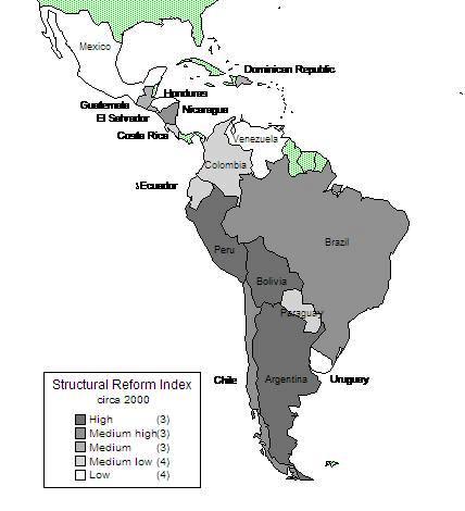 A modo de "atajo" gráfico, también incluimos un mapa de América Latina (ver Gráfico 2) en el que cada país es sombreado de acuerdo a su puntaje SRI hacia el año 2000. En promedio, los países en sur han mostrado un mayor alcance de reformas estructurales (a excepción de Uruguay) que países en el centro o norte de Sudamérica (a excepción parcial de Nicaragua).