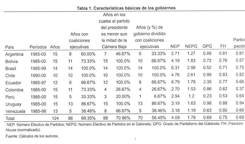 [4] Aunque Lora (2001) estudia 19 países del continente, la información disponible sobre los gabinetes de este período refiere sólo a nueve países. La información sobre los gabinetes proviene de Altman (2001). Autores interesados en la composición actual de los gabinetes en América Latina deberían leer el "Anuario Político de América Latina" de Revista de Ciencia Política y sus ediciones anteriores (ver por ejemplo Anastasia y Melo, 2009; Basabe-Serrano, 2009; Buquet, 2009; Funk, 2009; ver por ejemplo Leiras y Cruzalegui, 2009; Maingon y Welsch, 2009; Meléndez y León, 2009; Pachón, 2009; Uggla, 2009).
