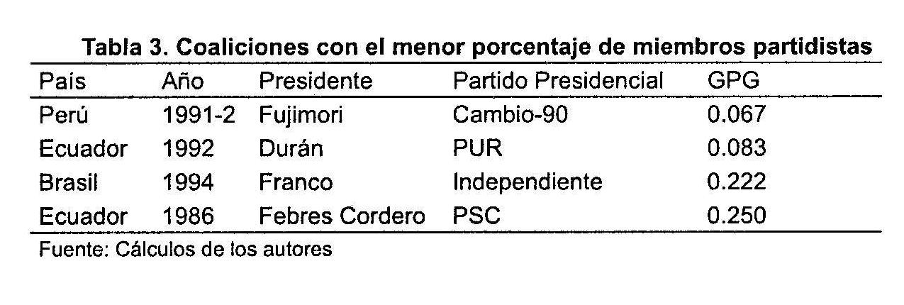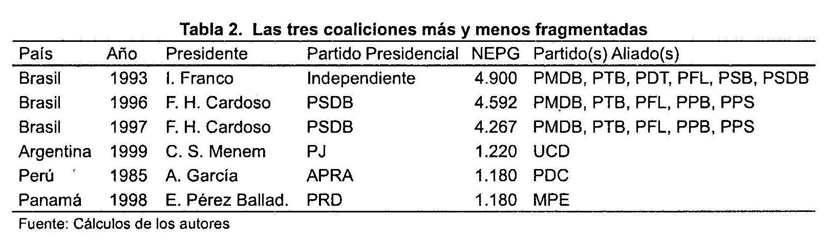 La fragmentación de la coalición ejecutiva varía considerablemente entre los 86 casos de coaliciones. Los gabinetes brasileros son los más fragmentados, alcanzando un NEPG (número efectivo de partidos en el gabinete) de 4.9 bajo el gobierno interino de Franco (1993). En el extremo opuesto, el gabinete de García de 1985 apenas sobrepasó 1 en NEPG. La Tabla 2 muestra las tres coaliciones más y menos fragmentadas.