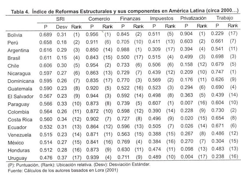Asimismo, los datos presentan importantes variaciones en términos de las variables dependientes. La Tabla 4 muestra el índice de Reforma Estructural global (SRI) y sus componentes para todos los países latinoamericanos (hasta aproximadamente el año 2000). Este Cuadro también muestra el ranking de cada país basado en sus puntajes dentro de cada ponente del SRI. Al mirar los puntajes globales del SRI, Bolivia y Uruguay tuvieron las mayores y menores reformas dentro de América Latina, respectivamente.