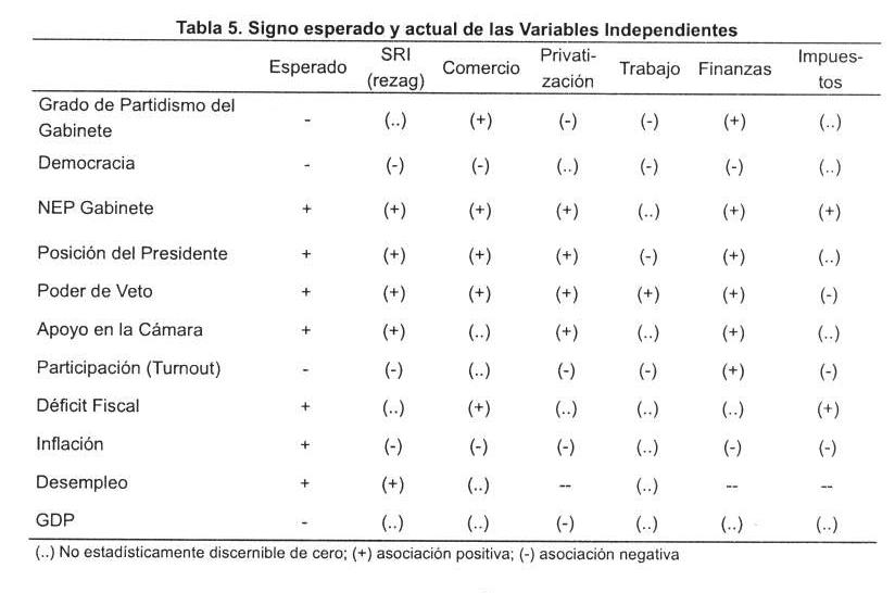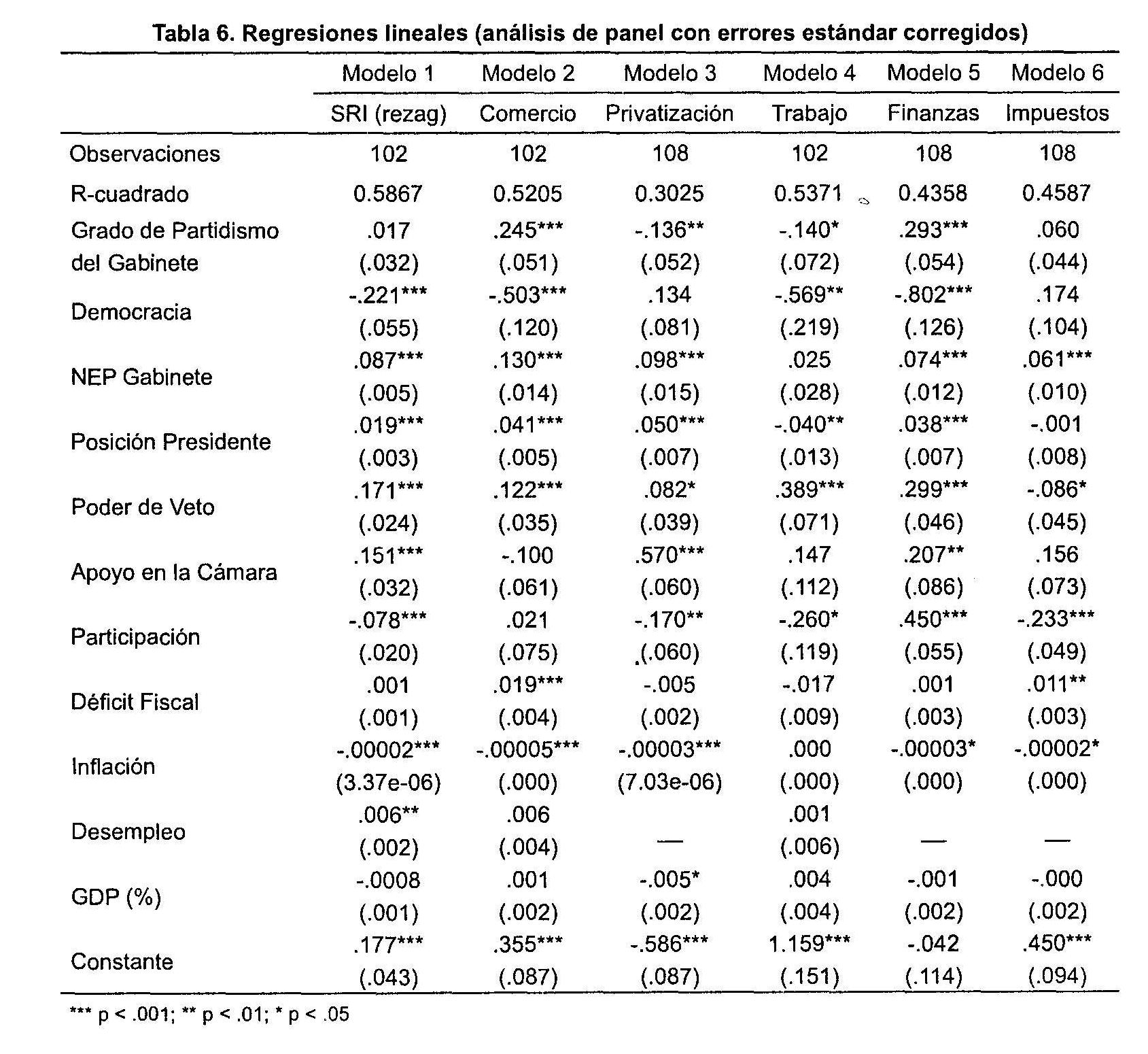 La Tabla 6, muestra los resultados para el modelo de SRI y todos sus componentes. El mayor hallazgo es que la variable democracia (Freedom House normalizado) nos ayuda a predecir el alcance de las reformas económicas. Como hipotetizamos, cuanto más democrático es un país, más alto es el "precio" de implementar reformas costosas y mayor es la demora en aprobar su implementación. También se muestra que si el proceso de construcción de una coalición ejecutiva resulta exitoso, los gobiernos están más propensos a avanzar exitosamente en sus iniciativas de reforma estructural que los gobiernos de partido único. Por supuesto, esto es contingente a la ubicación ideológica del partido del jefe del ejecutivo. Como anticipamos, en términos generales, cuanto más a la derecha está un presidente, más amplio es el alcance de las reformas. Esto es así en todos los modelos, excepto en trabajo. Para este modelo, la posición ideológica del partido del presidente resultó con el signo opuesto que en los otros modelos. Ello significa que cuanto más a la izquierda está el partido del presidente, tendrá más propensión a avanzar con reformas laborales. Esto puede ser parcialmente explicado por el hecho de que a fin de pasar proyectos de reformas laborales, los presidentes pueden necesitar tener un diálogo fluido con sindicatos y asociaciones de trabajadores.