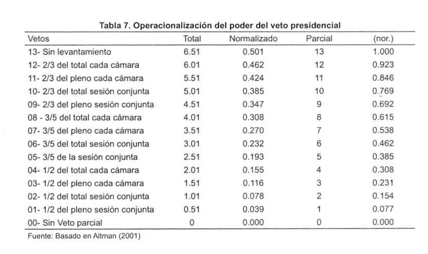 Cuanto más fuerte es el presidente, mayor es la magnitud de las reformas estructurales. Como argumenta Weyland (2002), "los presidentes que cuentan con gran influencia institucional logran imponer el costo inevitable de reestructuras económicas y persuadir a diferentes actores políticos y grupos socioeconómicos para cooperar con sus políticas de ajuste" (2002: 22-23; traducción de los autores). También, los poderes presidenciales son relevantes porque "los sistemas presidenciales tienden a funcionar mejor con limitados poderes ejecutivos sobre la legislación, principalmente porque un ejecutivo débil significa que el congreso tiene más oportunidades para debatir e intercambiar favores sobre temas controversiales" (Mainwaring y Shugart, 1997b: 436; traducción de los autores). Lamentablemente la fuerza del presidente no ha sido adecuadamente operacionalizada aun, aunque hay buenos intentos para captar su complejidad (ver Frye, 1997; Hellman, 1996; McGregor, 1994; Samuels y Shugart, 2003; Shugart y Carey, 1992; Shugart, 1998). Siendo conscientes que los poderes presidenciales son multidimensionales, usaremos un proxy para medirlo, a saber: un continuo normalizado del apoyo legislativo necesario para levantar vetos (como se expresa en la tabla 7 en el Anexo). Manteniendo otras variables constantes, es más difícil levantar un veto presidencial si la cantidad de legisladores requerida refiere al pleno del parlamento en lugar de a un quórum. Asimismo, existe consenso de que el veto parcial es más fuerte que un veto total (Mainwaring y Shugart, 1997a; Morgenstern, 1996; Morgenstern, 1999; Shugart y Carey, 1998; Shugart y Carey, 1992). Por tanto, en esta investigación, arbitrariamente decidimos codificar el veto parcial como el doble más fuerte que el veto total.