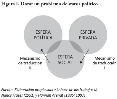 Esnecesario aquí hacer referencia a lo que Arendt (1996: 41) denomina el carácter privativo de lo privado, que supone que lo que hacen quienes viven recluidos en el ámbito doméstico es permanecerrecluidoren la oscuridad delas cuatro paredes del hogar.Sólo en el ámbito público o social se da la capacidad de hacer visibles las acciones de los hombres. Es decir, las instituciones domésticas –al igual que las instituciones económicas─“encierran” ciertos temas en territorios discursivos especializados, “protegiéndolos” del cuestionamiento generalizado y de conflictos de interpretación amplios y diseminados (Fraser 1991: 16). Como resultado, se constituyen como los espacios “autorizados” de las interpretaciones específicas sobre las necesidades, al incrustarlas en ciertas cadenas específicas, pero incuestionadas, de relaciones causales. Cuando estas necesidades logran salir de dichos espacios, Fraser le llama necesidades “escurridizas” o “fugitivas” debido a que se han “fugado” de los enclaves discursivos construidos para su interpretación. Asimismo, al salir de dichos espacios entran en un territorio que la mencionada autora denomina –siguiendo a Hannah Arendt─ lo “social”, como lugar donde se confronta el discurso sobre las necesidades fugitivas entre competidores heterogéneos asociados con una amplia gama de diferentes públicos. Al entrar en el espacio de lo “social”, dichas demandas son potenciales de convertirse en focos de la intervención estatal orientada a la administración de la crisis (Fraser 1991: 17-19).