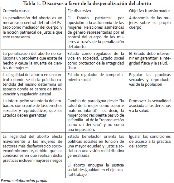 Es así que, una vez que el tema entró en el ámbito político, el eje discursivo en el cual se basaba la lucha de las feministas─esto es: aborto regulado y con garantías, la libertad de elección de las mujeres o más allá la lucha contra el patriarcado─ fue al menos en parte sustituido por otras nociones, entre las que se destaca la“justicia social” y “la salud sexual y reproductiva”, demandas asociadas a la deseabilidad de intervención del Estado sobre el comportamiento social, al cuerpo médico y al eje capital-trabajo. Es así que, las soluciones planteadas se concentran en la regulación de la práctica y en la educación para su prevención. Las siguientes citas dadas en el espacio parlamentario ejemplifican algunos de los ejes discursivos de aquellos actores que apoyaron la iniciativa: