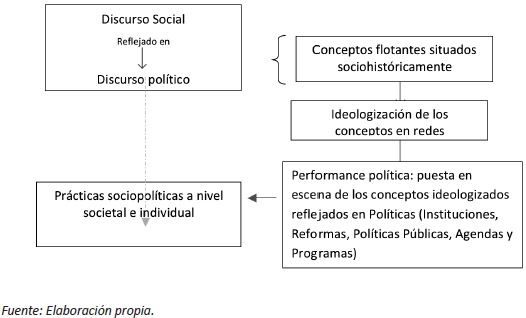 En ese marco, nos parece apropiado concebir que los discursos están configurados por conceptos políticos que circulan en el campo político, que tienen una fuente ideológica y una pretensión performativa, es decir, una búsqueda de condicionamiento y afectación de las prácticas concretas en el campo político y en la sociedad. Un modo de verificar esto es precisamente analizar el establecimiento de significados, conceptos y, en definitiva, sentidos comunes que intentan ser difundidos e inscritos socialmente desde el discurso. Por ejemplo, en los debates públicos de América Latina términos como participación, democracia, gobernabilidad, seguridad, populismo o soberanía, suelen utilizarse para fijar posiciones políticas sobre diversos tópicos; ellos están disponibles para su uso político, pero sus significados en general no se explicitan o bien se les asocia con otros conceptos, inscribiéndose en contextos temáticos que delimitan sus significados, reduciendo o excluyendo otros significados posibles.