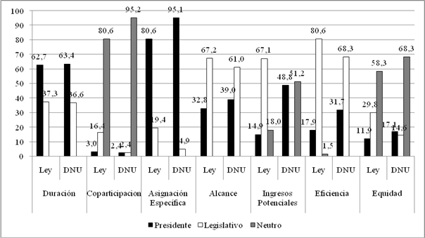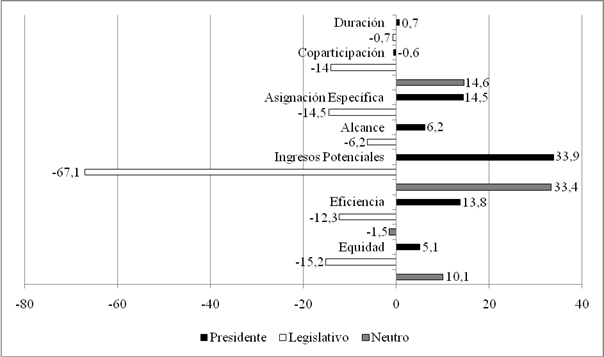 Las barras del gráfico 2comparan las diferencias, en cada dimensión impositiva, del contenido de decretos y leyes para cada categoría de sesgo (presidencial, legislativo o neutro).