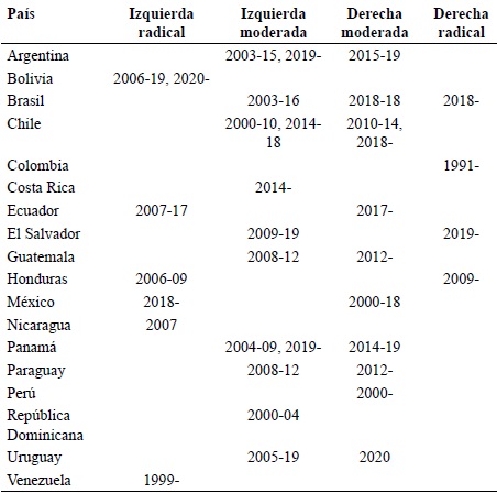 Las fuerzas de derecha han mantenido su preeminencia tradicional en Paraguay y Colombia, al tiempo que también han avanzado en algunos países centroamericanos como Honduras y Guatemala. En el caso de Colombia, la derecha tradicional ha dado paso, a partir de la emergencia y permanente centralidad del liderazgo de Uribe en el sistema, a una secuencia de liderazgos personalistas (Santos y Duque), aun cuando tal como señalan Rodríguez-Raga y Wills-Otero en su artículo en este número especial, el partido Centro Democrático está tratando de montar una organización partidaria que trascienda los personalismos. El caso de Ecuador, por su parte, registra un giro no electoral, en el sentido que el presidente Moreno, ungido como continuador del liderazgo de Correa, una vez en el poder se corre a la derecha. A su vez, el reciente triunfo del banquero Guillermo Lasso implica la aparición de una derecha electoral que, si bien es personalista, podría eventualmente dar paso a una organización partidaria (ver al respecto el artículo de Navia y Umpierrez de Reguero en este número especial). En el caso de Paraguay, la anr (Partido Colorado), retoma el control del ejecutivo luego del interregno marcado por el trunco gobierno de Lugo, mientras que, en El Salvador, el liderazgo de derecha radical de Nayib Bukele desplazó, súbitamente, a uno de los sistemas bipartidistas más institucionalizados de la región (fmln y arena). También es importante notar que fuerzas de izquierda lograron retomar el control del ejecutivo luego de interregnos de derecha, en Argentina, Bolivia (en que la derecha llega al poder irregularmente y es desplazada por vía electoral), y México.