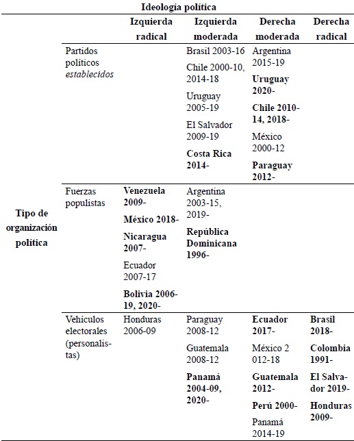 Tabla 2: Trayectoria ideológica y organizacional reciente de los sistemas de partido latinoamericanos