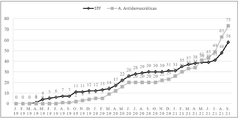 O Gráfico 2 mostra como os conflitos com o stf tomaram nova proporção no segundo trimestre de 2020, logo depois que a Pandemia de Coronavírus chega ao país e o Governo Federal rapidamente adota postura negacionista em relação às medidas de segurança sanitária a serem tomadas (Costa y Bernardi, 2020). Até setembro de 2020, percebe-se a profusão de situações relacionadas ou stf. Isso se dá devido a postura da Corte de interferir nas ações do Governo Federal durante os primeiros meses da pandemia no país, como na determinação de independência de estados e municípios na formulação das próprias regras de controle sanitário, e nas desautorizações referentes às tentativas de suspensão das medidas de isolamento.