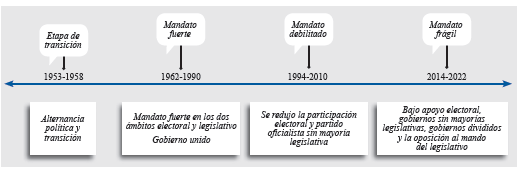 -1953 y 1958: etapa de transición.-1962-1990: fuerte mandato.gobierno unido-1994-2010: mandato debilitado.-2014-2022: mandato frágilgobiernos divididos