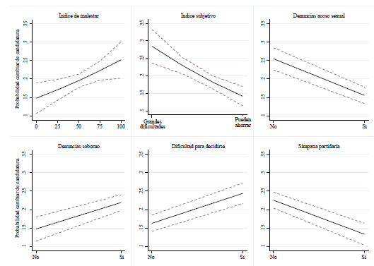 En primer lugar, la probabilidad de cambio en la preferencia del voto incrementa con el malestar social, la dificultad para decidirse y otro factor específico: las denuncias de soborno de una de las candidaturas. Por otra parte, este mismo modelo muestra que la probabilidad de volatilidad en la campaña disminuye conforme aumentan los ingresos de las personas consultadas. También, dicha probabilidad es menor si la ciudadanía posee simpatía partidaria y opina que las denuncias de acoso sexual influyeron en su preferencia (gráfico 6).