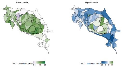 En primera ronda, el ppsd ganó únicamente tres cantones del país -por muy poco margen-, todos localizados en la provincia de Alajuela: San Ramón, Atenas y San Carlos. No obstante, el voto nacional lo ubicó en segundo lugar y le dio la posibilidad de optar por el balotaje con el pln. El partido oficialista pac desapareció por completo del mapa electoral, pues no logró ganar ni un solo cantón en la primera ronda de 2022.
