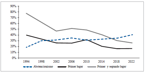 Después de un comportamiento oscilante en la primera década de este siglo, los partidos políticos que obtienen el primer lugar en primera ronda tienen un respaldo cada vez más pequeño con respecto al total del padrón nacional. Más aún, el respaldo obtenido por el primer y segundo lugar en 2022 es el más bajo hasta ahora reportado. Esta dinámica contrasta con la tendencia creciente del abstencionismo, que alcanzó su nivel más alto en esta ocasión.