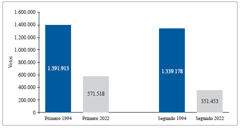 Una manera concreta de ver esta disminución del respaldo ciudadano a los partidos es comparar la cantidad de votos que obtuvo el partido ganador en 1994 y 2022. Hace 28 años, cuando el padrón electoral tenía 1.660.562 votantes menos que en 2022 (casi un 40 % más pequeño), el partido ganador obtuvo más de dos veces más votos que la agrupación ganadora en la primera ronda de 2022, con un padrón mucho más grande. De igual manera, la agrupación que alcanzó el segundo lugar en 1994 obtuvo cuatro veces más votos que el obtenido por el partido en segundo lugar en la primera ronda 2022 (gráfico 2). Si estas cifras se comparan con respecto al total de la población, los apoyos descritos son mucho menores.