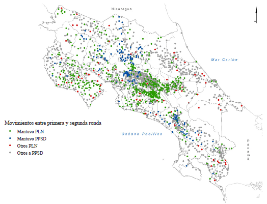 Los resultados del balotaje fueron radicalmente opuestos. El ppsd desplazó por completo al pln de la mayoría del territorio. Ganó 53 cantones y, con ello, el mandato del Ejecutivo por primera vez. En municipios como San Carlos, el ppsd amplió su ventaja y alcanzó el 58 % de los votos; en San Ramón, el 61 %, mientras que en otras localidades en las que había perdido en febrero, ganó en abril; es el caso de Grecia (57 %) y Alajuela (55 %). El pln, por su parte, logró el triunfo solamente en 29 cantones, perdió 34 con respecto a la primera ronda y con ello acreditó la tercera derrota consecutiva en un balotaje. En algunos municipios del centro del país, la ventaja del liberacionismo fue reducida en el balotaje, como en Goicoechea (50 % de los votos), Tibás (51 %) o San José (52 %). En pocos municipios del país el pln alcanzó un alto respaldo, como en Montes de Oca (61 %), Escazú o en Curridabat (59 %).