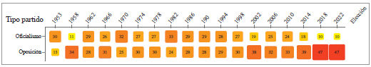 Gráfico 3. Composición del Congreso por período, según cantidad de representantes del partido oficialista y de los opositores, 1953-2022