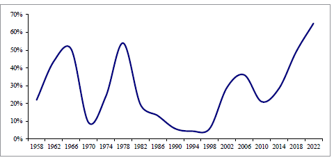 Los cambios en las preferencias partidarias entre 2018 y 2022 reportados por el índice son los más altos de los últimos 65 años; superan los registrados entre 1962 y 1966, y entre 1974 y 1978 (gráfico 4). Analizados desde una perspectiva histórica, los incrementos en la volatilidad electoral en el período 1953-2022 produjeron alteraciones importantes en la correlación de fuerzas políticas; particularmente, en las elecciones de 1966, 1978, 2006, 2018 y 2022. En estos procesos electorales, los cambios en el respaldo generaron desplazamientos y sustituciones de partidos políticos de una elección a otra (pac y prn recientemente), tal y como sucedió con Unión Nacional (un) en 1962 y Unificación Nacional (unac) en 1978.