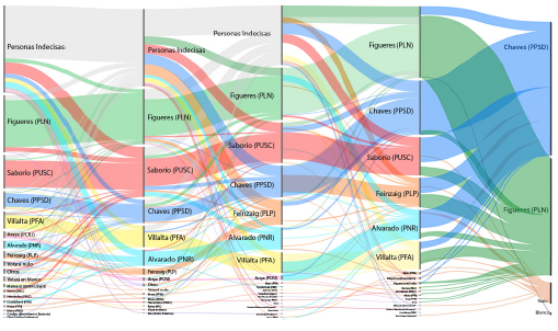 Mediante esta metodología de investigación pudo comprobarse que el bajo respaldo inicial de todas las candidaturas presidenciales propició que los incrementos o pérdidas de apoyo alteraran constantemente las posiciones de las personas competidoras en distintos momentos de la carrera electoral. Por lo tanto, entrar a competir en segunda ronda fue una posibilidad realista para varias de las opciones en disputa, dado lo cambiante de las preferencias. En el gráfico 5 se aprecian las distintas trayectorias de las preferencias del electorado. En este, cada flujo agrupa la decisión de grupos respectivos de votantes en las cinco rondas del estudio. Que el color de la línea sea siempre el mismo significa que ese grupo no varió su preferencia por una de las determinadas opciones. Como se aprecia, los «fieles» partidarios son pocos y fueron, sobre todo, liberacionistas. El grupo más numeroso es el de votantes que «brincaron» de una opción a otra. Asimismo, esta visualización revela que las personas indecisas se inclinaron por varias de las opciones existentes y no únicamente por una o algunas pocas en particular.