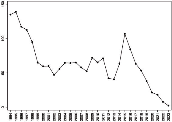 Donde sí hubo avances tangibles fue en la lucha contra el crimen organizado. Durante décadas, las infames pandillas o maras, como la Mara Salvatrucha y la Mara Barrio 18, habían aterrorizado a la población mediante asesinatos, secuestros, y extorsiones. Las maras contribuían al clima de violencia que reinaba en el país y que, en 2015, convirtieron a El Salvador en uno de los países más violentos del mundo, con una tasa de 107 asesinatos por cada 100.000 habitantes (Freeman y Perelló, 2024). Si bien la tasa de homicidios venía a la baja desde 2015, Bukele adoptó medidas para reducirla aún más (ver Figura 1). En un comienzo, al igual que los gobiernos de Arena (1989-2009) y FMLN (2009-2019), Bukele supuestamente negoció con las pandillas (Martínez, Cáceres y Martínez, 2021). Pero al quebrarse la tregua repentinamente el 26 de marzo de 2022, cuando una ola de violencia cobró 62 vidas en un solo día (Delcid, 2022), Bukele adoptó medidas de mano dura. El día después de los asesinatos, la Asamblea Legislativa controlada por Nuevas Ideas aprobó un régimen de excepción que limitaba derechos y libertades constitucionales y facilitaba la detención arbitraria de personas. La Asamblea Legislativa ha renovado el estado de excepción mensualmente desde entonces (Labrador y Martínez, 2023).