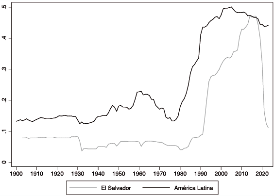 El auge de Bukele al poder ha ocurrido de manera paralela al retroceso democrático del El Salvador. La Figura 2 muestra datos de V-DEM para graficar el índice de democracia liberal para El Salvador y América Latina entre 1900 y 2023. El índice es un intervalo cuyo rango es de cero y uno para niveles nulos y plenos de democracia liberal, respectivamente. Tal como lo indica la Figura 2, los regímenes autoritarios han sido la norma histórica en El Salvador. A mediados de los noventa, tras una violenta guerra civil, el país hizo su transición hacia la democracia. Durante tres décadas, los gobiernos de derecha de Arena (1989-2009) y de izquierda del FMLN (2009-2019) fortalecieron, gradualmente, la democracia -a pesar de sus evidentes fallas en materia de corrupción, seguridad, y reducción de la pobreza-. El Salvador registró sus mayores niveles de democracia liberal entre 2014 y 2017.