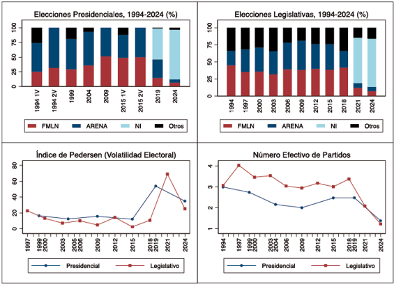 La Figura 3 revela la magnitud de la transformación experimentada por el sistema de partidos en El Salvador. Los dos primeros gráficos resumen los resultados de las elecciones presidenciales y legislativas entre 1994 y 2024, respectivamente. Tal como lo indica la Figura 3, El Salvador contaba con preferencias electorales estables, donde Arena y el FMLN recibían una mayoría de votos en contiendas presidenciales y legislativas, donde partidos pequeños también contaban con un porcentaje importante de votos. Sin embargo, dicha estabilidad cambió repentinamente en la elección de 2019, misma que marcó la irrupción de Bukele y la desplome en el apoyo hacia los partidos tradicionales. A su vez, la Figura 3 también muestra el índice de Pedersen de volatilidad electoral y el número efectivo de partidos. En términos generales, El Salvador mantuvo bajos niveles de volatilidad en elecciones presidenciales y legislativas entre 1997 y 2018. No obstante, dichos niveles se dispararon en la elección presidencial de 2019 y la elección legislativa de 2021. Si bien aquellos niveles de redujeron en 2024, se mantuvieron comparativamente altos al ser contrastados al período entre 1997 y 2018. Por su parte, el número efectivo de partidos (NEP) indica como un sistema predominantemente bipartidista a nivel presidencial y multipartidista a nivel legislativo se vio reducido a un sistema con un partido hegemónico en 2024.