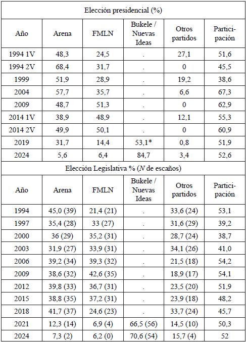 La victoria presidencial de Bukele no impactó la composición de la legislatura, cuyos miembros habían sido electos en 2018 y en la que dominaban los dos partidos tradicionales. El choque entre poderes no se hizo esperar. En febrero de 2020, Bukele irrumpió en la Asamblea Legislativa, rodeado de militares, buscando aprobar fondos para poder financiar sus políticas de seguridad (Guzmán, Rauda y Alvarado, 2020). La presencia de militares armados al interior de un poder independiente del Estado fue una señal de lo que estaba por venir. La estrategia de Bukele de priorizar la seguridad, añadido a la impopularidad de los partidos tradicionales, eventualmente le dieron la mayoría legislativa que requería para gobernar. En las elecciones legislativas de 2021, Nuevas Ideas obtuvo 66,5 % de votos (equivalente a 56 escaños de 84). Arena y FMLN continuaron derrumbándose, al quedarse con 14 y 4 escaños, respectivamente. Partidos pequeños, que frecuentemente se aliaban con el gobierno, obtuvieron los 10 escaños restantes (Tribunal Supremo Electoral, 2024).