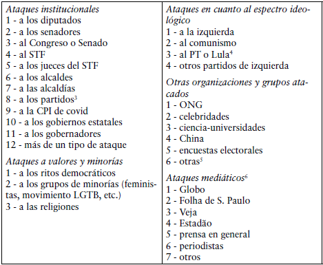 A partir de los comportamientos mapeados en la literatura sobre el tema, en este artículo el repertorio discursivo de ataques y de construcción de los enemigos es el objeto de análisis. Ya existe el consenso de que esta es una característica típica de la extrema derecha digital, definida por un conjunto de rasgos agresivos, descalificación de opositores e instituciones, así como la difusión de discursos de odio y desinformación sobre dichos destinatarios (Ekman, 2014; Chagas, 2022; Dalmonte y Dibai, 2019; Darmstadt, Prinz y Saal, 2019). Las plataformas como X, Facebook, WhatsApp y Telegram son usadas para difundir este tipo de mensajes. Los ataques, incluso, se dirigen no sólo a las instituciones, sino también a individuos, como jueces y periodistas, así como a ideologías (Löwy, 2015; Zanotti y Roberts, 2021) o países considerados «enemigos» (Quinan, Araujo, y Albuquerque, 2021).