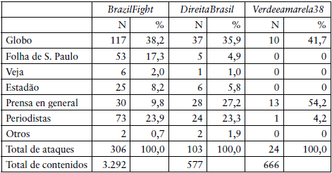 Hay ataques en todas las páginas, sin embargo, hay un punto de congruencia entre BrazilFight y DireitaBrasil, que dirigen muchos más ataques a la prensa que Verdeeamarela38. Una vez más, en comparación, las cuentas tienen comportamientos diferentes respecto a estas direcciones de ataque (Tabla 10), lo que refuerza la H2. BrazilFight y DireitaBrasil son las cuentas que más critican al periodismo y ambos critican con mayor intensidad al grupo Globo. El siguiente tuit ejemplifica dicho objetivo:
