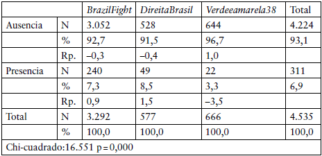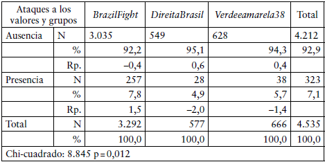 También vinculado al ámbito político, se observaron ataques a los valores (Tabla 7). Estos, en conjunto, suman un 7,1 %. Pero, cuando se separan las páginas, queda claro que, una vez más, Brazilfight (7,8 %) y Verdeamarela38 (5,7 %) son las que cuentan con un puntaje más alto y se diferencian -aunque no significativamente- de DireitaBrasil (4,9 %), como señala el residuo negativo (Rp = -2,0).