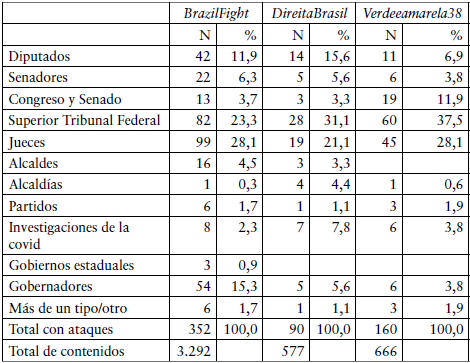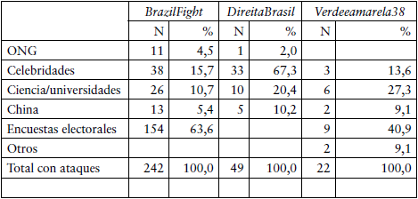 Para finalizar el análisis, se observaron ataques a otras organizaciones y grupos: ONG, celebridades, ciencia, universidades, investigación científica, China, institutos de encuestas electorales15 y otros. Aunque se trata de un tipo de ataque menos común respecto a las demás variables, aparece en las tres cuentas, principalmente en las páginas de DiretaBrasil y BrazilFight. Tabla 11.