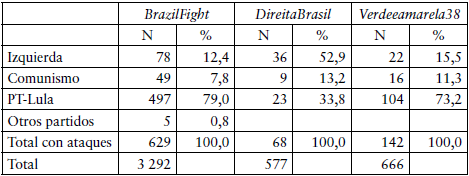 En cuanto a los destinatarios específicos de este tipo de ataque (Tabla 4), BrazilFight y Verdeeamarela38 -ambos con un mayor porcentaje de ataques- también presentan más similitudes. La primera dirige el 79 % de los ataques ideológicos al Partido de los Trabajadores o Lula, mientras que la segunda enumera el 73,2 % en la misma categoría. Son objetivos nacionales, lo que corrobora la primera hipótesis, en cuanto a la coexistencia de repertorios tanto nacionales como internacionales. Si los datos generales descritos sobre los tipos de ataques mostraban una «copia» del modelo internacional, al observar los destinatarios comienzan a aparecer elementos específicos del contexto nacional.