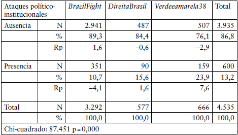Complementariamente, se identifica que las instituciones políticas son destinatarios frecuentes de la extrema derecha digital (Castelli y Pirro, 2019; Löwy, 2015). En el caso de esta investigación, uno de cada diez tuits ataca a una institución política. De manera comparada (Tabla 5), BrazilFight suma sólo el 10,7 % y los residuos son negativos (-4,1), demostrando que esta acción tiende a ser menos adoptada en sus estrategias de comunicación en comparación con las otras cuentas. DireitaBrasil, por otro lado, tiene un 15,6 % de su contenido atacando a alguna institución o a sus representantes y, aunque el residuo no sea estadísticamente relevante (por encima de 1,96), la señal apunta a una dirección positiva. Verdeeamarela38 es donde se encuentra el residuo más fuerte (Rp = 7,6), al totalizar 23,9 % de sus tuits atacando alguna institución política.