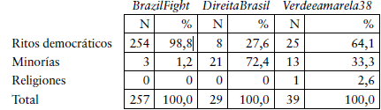 Cuando se presta atención a las especificidades de los tipos de valores o minorías atacados en cada página (Tabla 8 10), se observa que BrazilFight y Verdeeamarela38 tienen otra convergencia, ya que los ritos democráticos, en general, son atacados por ambas. El siguiente tuit ejemplifica este tipo de comportamiento: