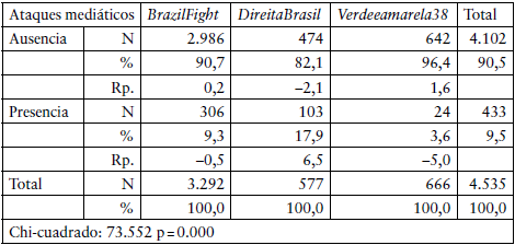 La presentación de los datos en el análisis se divide por tipo de ataque, lo que presenta las frecuencias simples para observar el total y, posteriormente, se comparan las páginas con la ayuda de la prueba de chi-cuadrado (χ2) y residuos estandarizados. Para fines comparativos, se aplicó la prueba de chi-cuadrado (χ²) para comprobar si las categorías están asociadas. Cervi (2014) señala que un número elevado significa que las categorías no son independientes, es decir, que están asociadas. En cuanto a los residuos, estos son significativos cuando están por encima de 1,96 o por debajo de -1,96 (Cervi, 2014).