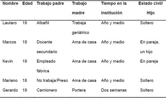 El estudio se realizó en un centro socioeducativo cerrado de la ciudad de Córdoba que recibe a jóvenes en conflicto con la ley penal - con sentencia firme o no - y que acorde a la normativa vigente debieran tener entre 16 y 18 años, aunque en la realidad se encuentran alojados jóvenes por debajo o encima de esta edad. Trabajamos con cinco jóvenes de entre 18 y 19 años de edad que se encontraban en uno de los pabellones durante el período en que duró la recolección de datos (julio - septiembre de 2017). La selección de los mismos se realizó a partir de un muestreo intencional que contempló como principales criterios de inclusión la edad (ser mayor de 17 años) y la participación voluntaria en el estudio. En la tabla 1 se presenta información sobre los datos sociodemográficos.