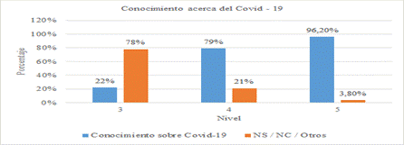 En el análisis comparativo respecto a los conocimientos sobre los motivos del confinamiento, los datos muestran una diferencia significativa inter nivel (Figura 1). Mientras que en el nivel 3 años el 22% de niños y niñas manifiestan contar con información al respecto, el porcentaje asciende en los grupos de nivel 4 a 79%y nivel 5 a 96%.