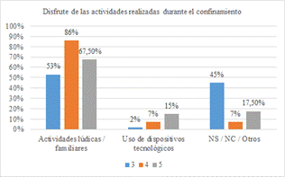 Respecto a cómo fueron los días de confinamiento en sus hogares no se presenta ninguna apreciación negativa al tiempo en casa, aunque después en las respuestas se nota algún nivel de enojo con la situación de encierro (Figura 2). Algunas de las respuestas fueron: “Me gusta mucho jugar con mi papá” (V5); “A mí me gustó mirar pelis” (V3); “Algo que me hizo feliz, que Mamá me diera besos” (N4); “Jugar al Minecraft” (V5); “Jugar con el gato, se llama Trueno” (N3); “Me gustó más jugar con mi hermano” (V5)
