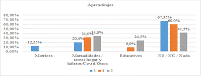 En relación a los aprendizajes (Figura 3) durante el tiempo de confinamiento en casa, se observa que se logran identificar en mayor medida en el nivel 5 años (58,50%), siendo alto el porcentaje de niños que no sabe o no contesta en los niveles 3 y 4 (67,35% y 60%).
